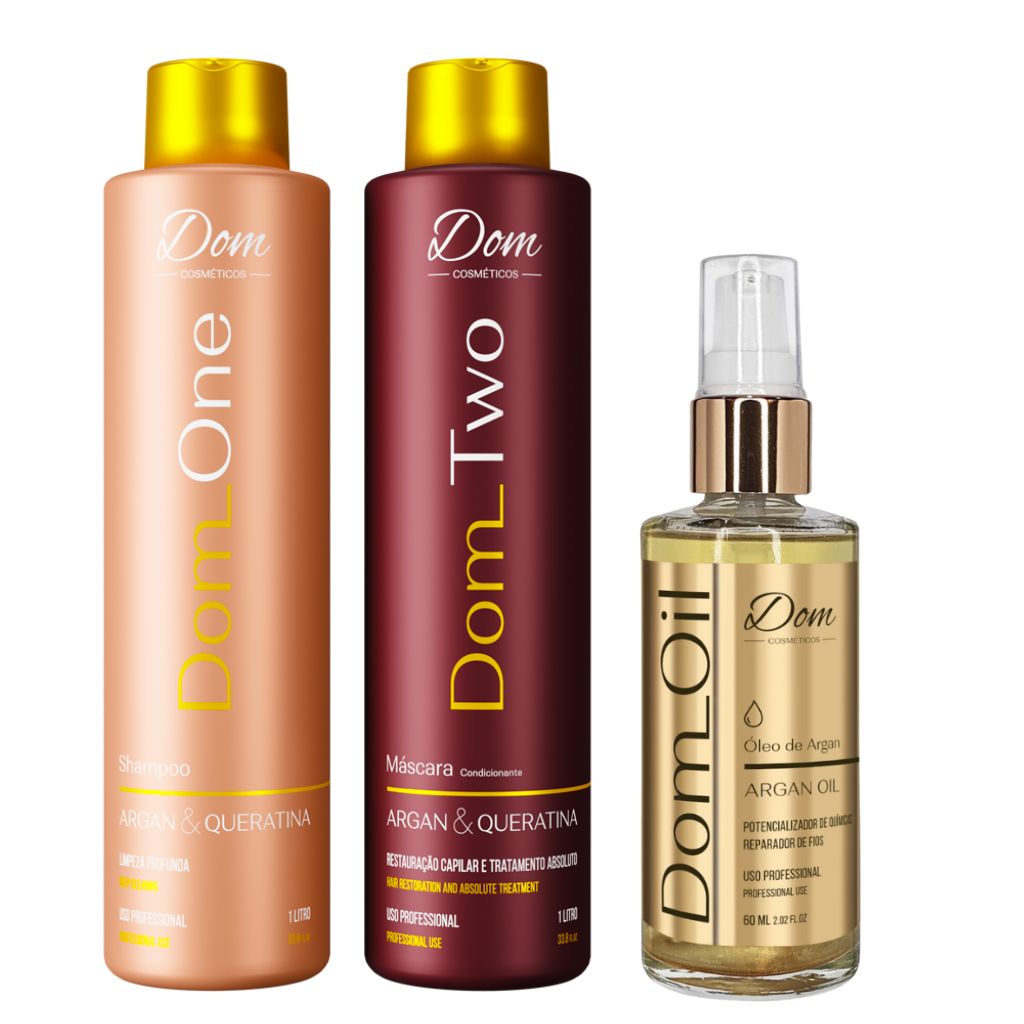 A Progressiva Dom Cosméticos One e Two é um tratamento 100% eficaz, elaborado para tratar profundamente e de forma intensa os fios que foram danificados. Dom contem Óleos de Argan e Queratina, que devolvem os nutrientes perdidos, promove brilho extremo, maciez, alinhamento e também proporciona ao cabelo um aspecto natural, sem deixar pesado e oleoso. O Dom Oil, é um tratamento potencializador de químicas e reparador de fios. Sela as cutículas e adiciona maciez e brilho enquanto disciplina e corrige as pontas duplas. Acelera a escova e protege o cabelo do calor. Preserva a cor e diminui a agressão dos tratamentos químicos.