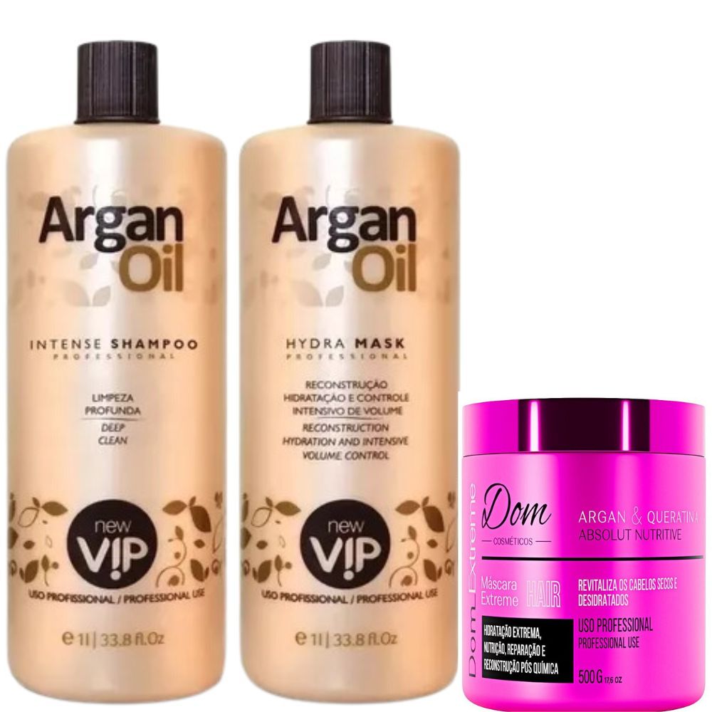 Das Progressivas e Btox Kit Escova Progressiva New Vip Argan Oil Mascara Extreme 500g é um tratamento tipo selagem térmica, indicada para cabelos danificados, ressecados e secos. Contém ativos de nano cristalização, hidratantes e óleo de Argan, que atuam nos fios como um defrizante, selando as cutículas, Já a máscara serve para todos os tipos de cabelos danificados, reconstrói e nutre, a saúde e o brilho natural. Foi formulado com polímetros umectantes, que reequilibram o nível de nutrição dos fios. Ver mais Vip